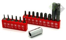 Deze bitset zitten mooi opgeborgen in twee handige bithouder, met daarin 14 Torx bitjes en een adapter om de bitjes te kunnen plaatsen op een 1/4" aansluiting.