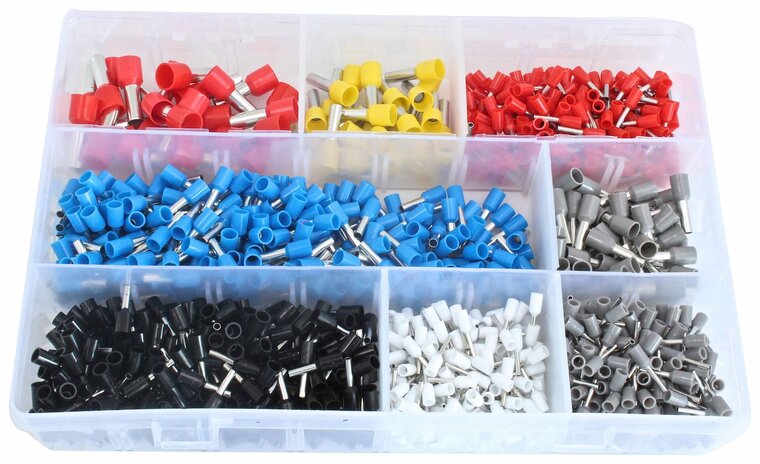 Een 1200-delige, Kleurgecodeerde adereindhuls krimpklemmenset. Geïsoleerde draadaansluitklem van vertind koper met goede elektrische geleidbaarheid, doorsnede 0,5-10 mm². Veel gebruikt onder andere in de auto-industrie en elektrische toepassingen.