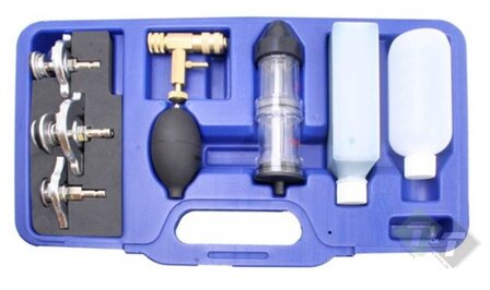 Testvloeistof voor een cilinder lekkage testerTijdens het testen mag geen rook of uitlaatgas in de ruimte hangen, want rookgas verontreiniging en maakt de testvloeistof onbruikbaar. Vul de onderste 2 kamers tot de stippellijn met testvloeistof. Blaas met uw adem wat lucht onder de tester en knijp in de rubberbal tot de testvloeistof groen wordt. Schroef voorzichtig de dop van het expansievat en zuig met draaiende motor lucht boven het expansievat op. Kleurt de testvloeistof blauw, dan is er geen lekkage. Verkleurt de testvloeistof geel, dan lekt de cilinderkop. Giet gebruikte testvloeistof nooit terug in de flacon. Na 10 keer gebruiken de tester reinigen met reinigingsvloeistof.