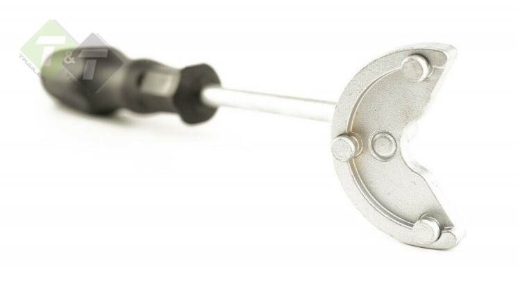 Een speciaal ontworpen sleutel van Trailer and Tools voor het vastschroeven van de schokbreker in het Mercedes-Benz W211 en T-model achteras (E-klasse stationwagen)