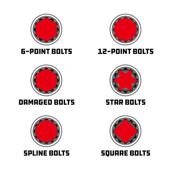 - Uitstekende grip op moeilijk gevormde boutkoppen: Het meertandprofiel grijpt dieper in op de boutkop dan een standaard dop, waardoor je meer controle hebt en minder snel doorschiet.