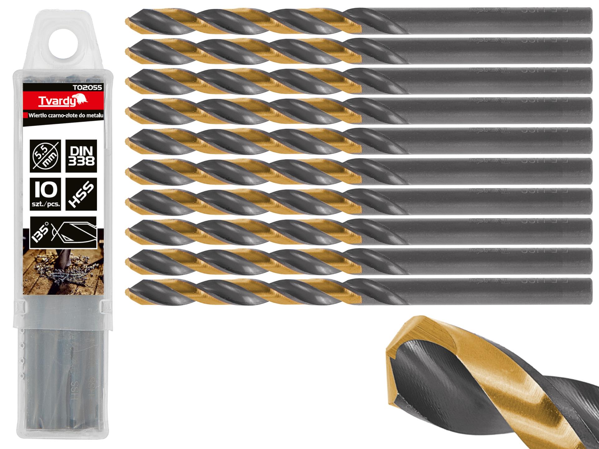 Goudzwarte metaalboren gemaakt van 4341 HSS snelstaal, bedekt met een TiN ( titaniumnitride) coating. Boren volgens DIN 338. Deze boren zijn bedoeld voor het maken van door- en blinde gaten. Ze hebben twee centrale bladen die onder een hoek van 135° zijn geslepen en groeven die de spanen effectief door het gat afvoeren.Boren bedekt met een TiN-laag zijn vooral bedoeld voor het bewerken van moeilijk verspaanbare materialen. Het gebruik van TiN-coating verhoogt de hardheid van de boor, versnelt het boorproces en zorgt voor een betere kwaliteit van de verwerkte elementen.